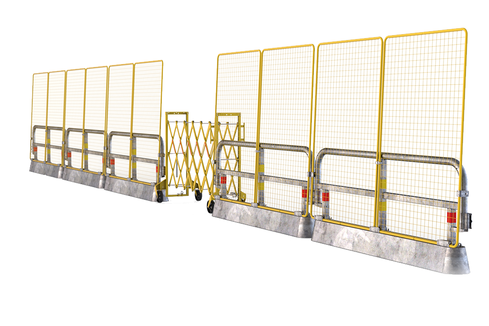 Ställbar arbetsgrind i kraftig konstruktion med steglös ändring i bredd och vinkel. Varje sektion har en spännvidd från 0,3 till 2,3 meter. Punkteringsfria hjul. Mått i hopfällt läge: Bredd 0,8 m x höjd 1,52 m. Vikt 55 kg.