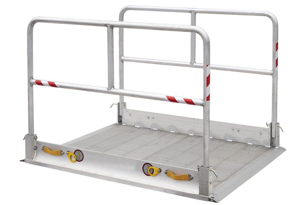Halkskyddad gångdel och räcken. Vikt 72 kg. Maxbelastning 1850 kg
