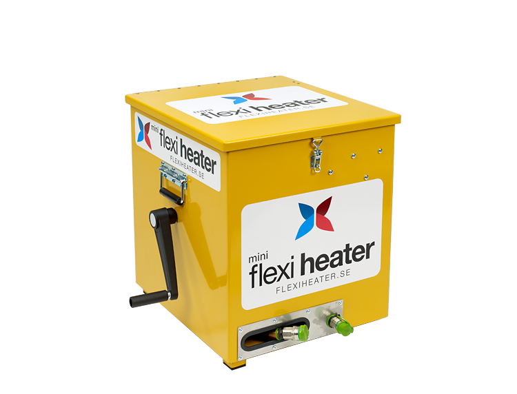 Mini Flexi Heater - liten behändig tjältinare. Drivs med 230 eller 400 volt och har en 50 meter lång glykolfylld slang i ett slutet system. Slangen kan enkelt skarvas med extra slang. Med en slangtemperatur på upp till 90°C blir resultatet snabb och effektiv tining av upp till 30 cm tjäle per dygn. Klarar att tina upp till 12 m2 tjäle (30 m2 med extra slangvinda) vid 400 volt. Vikt: 65 kg. Höjd: 520 mm. Bredd: 485 mm. Längd: 525 mm